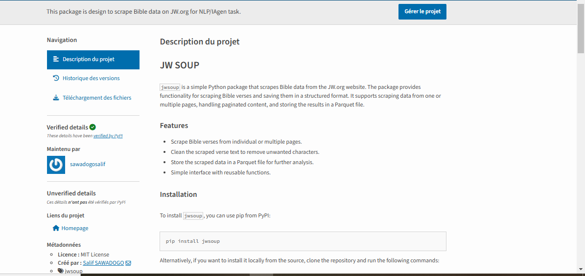 Grâce à un README.md couplé setup.py bien rédigés et au fichier HISTORY.md, vous obtenez une présentation claire et professionnelle de votre package.