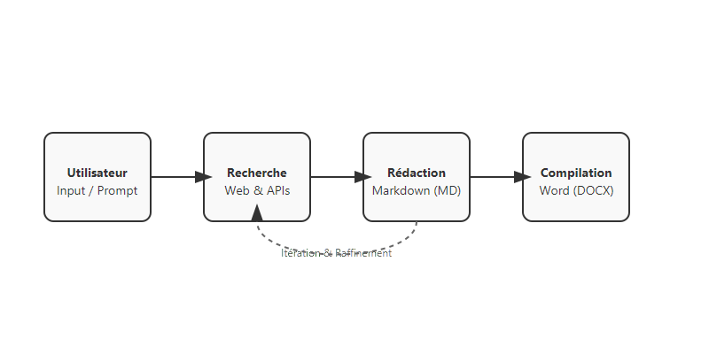 L'approche que je privilégie consiste à donner à l'IA les outils nécessaires pour construire le document pièce par pièce. Au lieu de rédiger le document d'un bloc, j'ai mis en place un cycle itératif où l'agent gère :