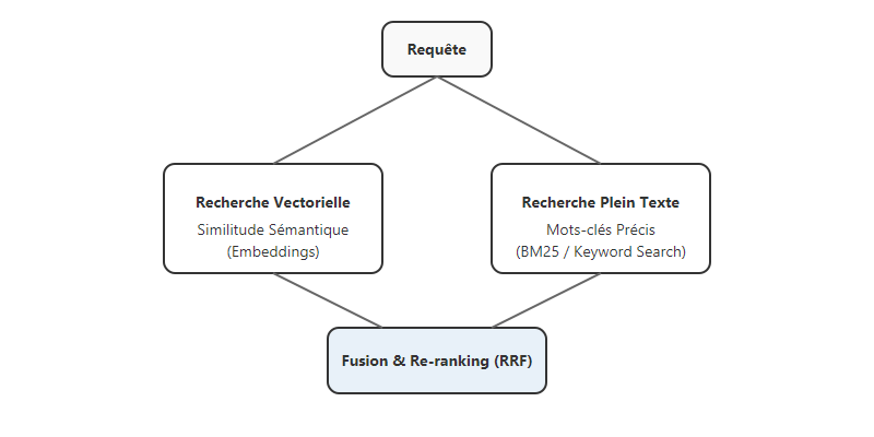Pour pallier ces défauts, j'utilise systématiquement une recherche hybride combinant : - Recherche Vectorielle (Embeddings) : Pour la compréhension sémantique (le "sens" de la question). - Recherche Plein Texte (BM25 ou Keyword Search) : Pour la précision chirurgicale sur les mots-clés, noms propres et codes.